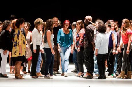 El problema comienza cuando la “gran pedagogía” se transforma en “pequeña pedagogía”, es decir, cuando la manifestación colectiva se muestra a otros en forma de espectáculo. Quienes miran son obligados a posicionarse de un lado u otro de la gente que molesta o la gente a quien se molesta. No hay términos medios. Pero los problemas no se le plantean a los espectadores, sino a los participantes que sólo querían ser agentes de una manifestación y ahora también son actores, es decir, acceden al también “pequeño” privilegio de la representación. La multitud que se manifiesta se convierte entonces en coro. El coro fue el procedimiento al que recurrió Brecht para sus piezas didácticas. En los años treinta, el coro podía hablar con una sola voz. Pero a principios del siglo XXI, ¿cómo articular un discurso respetando la singularidad de cada una de las voces? Borralho y Galante proponen una fórmula: cada voz es escuchada una vez a condición de que luego participe en la enunciación repetida de cada una de las siguientes voces. Sin embargo, esta fórmula puede no resultar suficiente.
