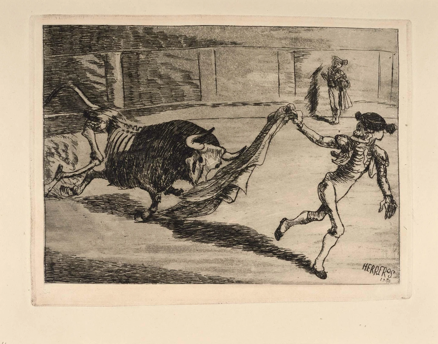 Enrique Herreros. La tauromaquia y la muerte. 1946. Aguafuerte y aguatinta sobre papel. 37 x 52 aprox. MNCARS 2