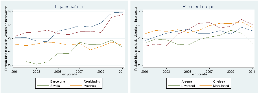 El siguiente gráfico muestra la evolución de la probabilidad de victoria media de los cuatro principales equipos en la Liga española (Barcelona, Real Madrid, Sevilla y Valencia) y de los cuatro principales equipos en la Premier (Arsenal, Manchester United, Liverpool y Chelsea) en las última 11 temporadas (2000/2001-2010/2011).