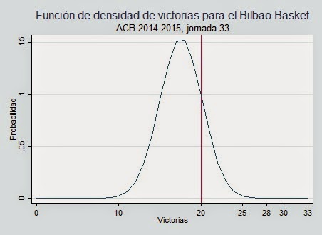 A continuación se muestran las funciones de densidad para el Real Madrid y el Bilbao Basket con una línea vertical que indica el número de victorias una vez acabada la temporada regular (jornada 33, que es cuando se otorgó el premio).