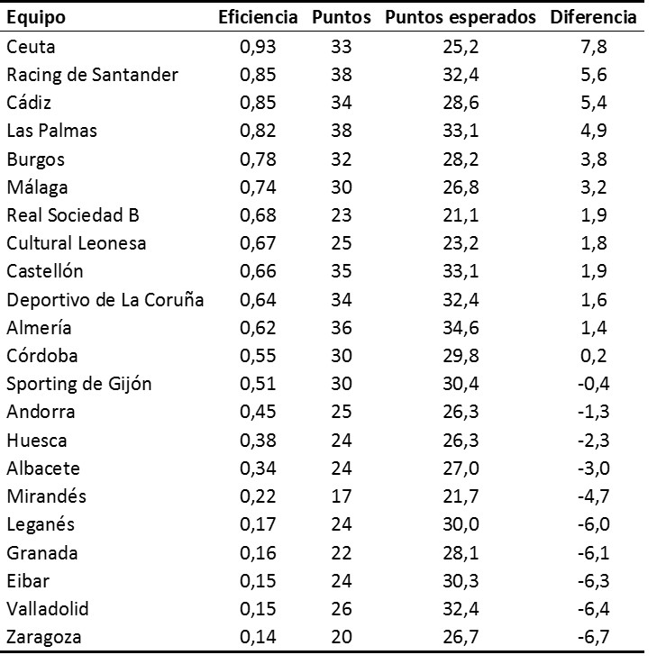 Sin lugar a dudas, el equipo que mejor ha rendido dado lo que se esperaba de él ha sido el Ceuta, que parecía abocado a luchar por evitar el descenso y está peleando las posiciones de honor. Le siguen el Racing de Santander, el Cádiz y Las palmas. Por abajo, Zaragoza, Valladolid, Eibar, Granada y Leganés tienen una eficiencia en torno a 0,15.