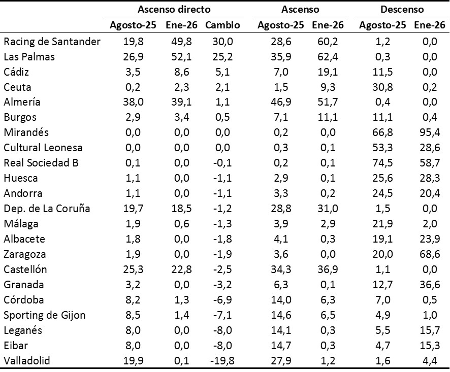 En cuanto a las probabilidades de ascender a día 12 de enero de 2026 destacan Las Palmas (62,4%), Racing de Santander (60,2%), Almería (51,7%), Castellón (36,9%) y Deportivo de La Coruña (31%). El resto de equipos no llega ninguno al 20%. En la lucha por el descenso las simulaciones le da al Mirandés por casi descendido con un 95,4%. El Zaragoza pinta feo con un 68,6%.