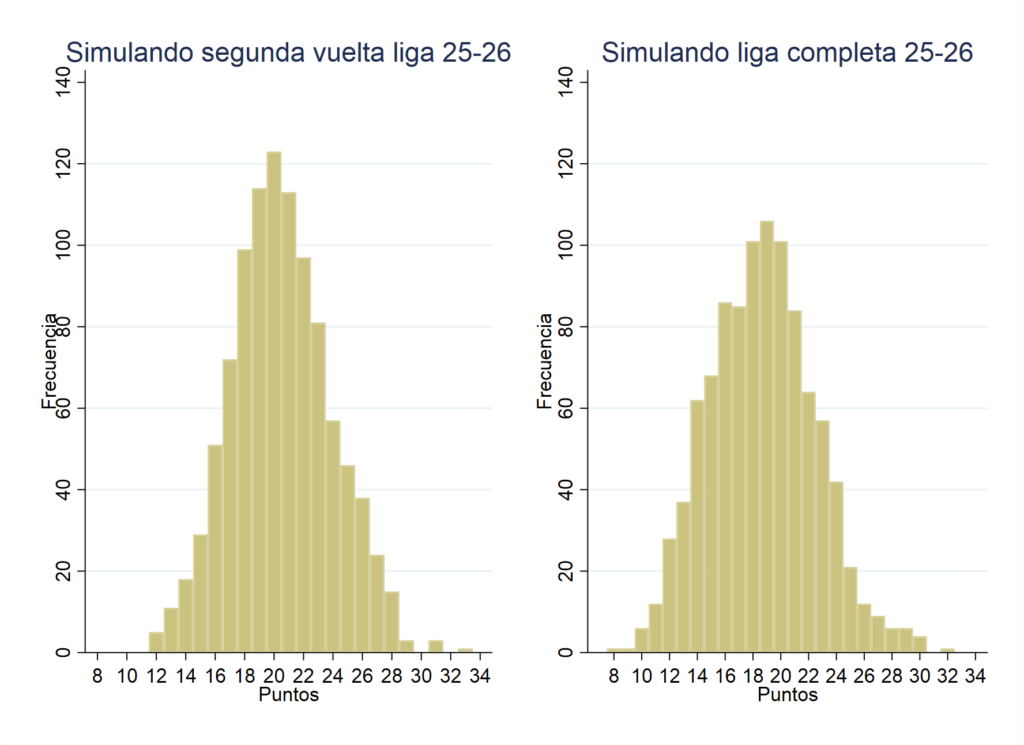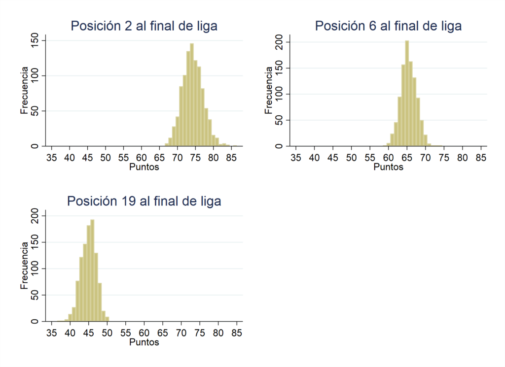 Con estos resultados se simula 1.000 veces la segunda vuelta así generando una distribución de probabilidades de quedar en cada una de las 22 posibles posiciones. Las simulaciones usan las cuotas de la primera vuelta para establecer las probabilidades para cada partido y así poder simular los partidos de tal forma de si la probabilidad de ganar del equipo local es 0,8 la probabilidad de que gane el partido en una simulación es del 80%. También se añade información de los resultados de la primera vía sumando un 40% de la diferencia entre puntos conseguidos y puntos realizados. Por último, se asume que en caso de llegar a la fase de ascenso la probabilidad de ascenso es del 25%.
