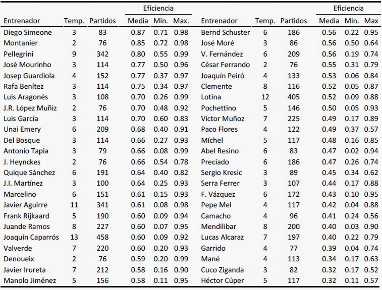 La siguiente tabla muestra el promedio, mínimo y máximo de la eficiencia de cada entrenador para las distintas temporadas en las que actuaron. Los resultados más importantes indican que el entrenador más eficiente hasta la fecha ha sido Simeone seguido por Montanier. Hay que destacar que estos entrenadores aparecen con un número bajo de temporadas. Si nos fijamos en los entrenadores que hayan estado más de 5 temporadas, el entrenador más eficiente y con una diferencia muy importante ha sido Pellegrini, seguido por el muchas veces criticado pero que según estos resultados lo ha hecho bien en sus equipos Unai Emery. Destacar también que Mourinho y Guardiola consiguen una eficiencia promedio muy similar y muy alta.
