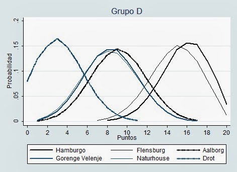 Donde se ve el gráfico promedio. En media hay dos equipos muy por encima del resto, normalmente hay 3 equipos intermedios y un último equipo con un nivel muy bajo como para participar en una competición como la actual EHF Champions League.
