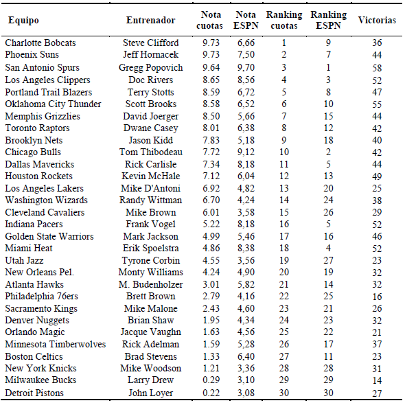 - De los 9 primeros entrenadores en el TE ranking sólo está ausente del ranking de la NBA el entrenador de los Memphis Grizzlies. Puede deberse que usando las cuotas se tiene en cuenta las lesiones de los jugadores y los Grizzlies han conseguido meterse en playoffs jugando muchos partidos sin uno de sus baluartes (Marc Gasol)