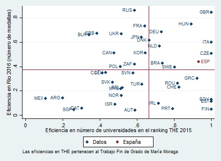 Hace unos días se publicaba un artículo de mi cosecha (junto con Carlos Gómez-González y José Manuel Santos-Sánchez) titulado “A country-level efficiency analysis of the 2016 Summer Olympic Games in Rio: A complete picture”, aquí el enlace a la revista y aquí el enlace a una versión completa de acceso no restringido. Las tres contribuciones principales de dicho artículo son considerar el número de deportistas en los JJ.OO. como uno de los outputs para calcular la eficiencia de los países, una metodología para calcular la ineficiencia de los países que no obtienen ninguna medalla así como resaltar la importancia de estimar las funciones entre similares (e.g., países del mismo continente). España, en los Mundiales de Londres 2017, no ha conseguido ningún metal por primera vez en la historia de los Mundiales de Atletismo. Desde luego es un retroceso, pero a continuación voy a presentar los resultados replicando la metodología de dicho artículo.