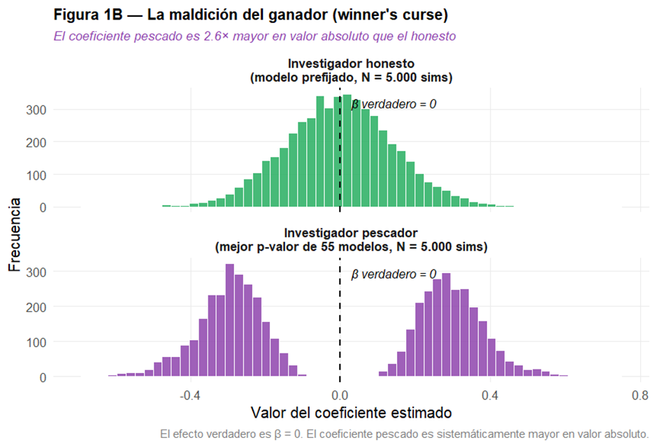 La Figura 1B ilustra el sesgo en los coeficientes. El coeficiente honesto tiene una distribución centrada en cero —como debe ser, puesto que no hay efecto real—. El coeficiente pescado tiene colas mucho más pesadas y está claramente separado del cero: los valores seleccionados por su bajo p-valor son también, por construcción, los más extremos.