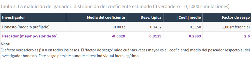 - El coeficiente «significativo» encontrado por búsqueda sistemática es un coeficiente sesgado. La winner’s curse garantiza que los coeficientes seleccionados por su p-valor bajo son, en promedio, más grandes en valor absoluto que el verdadero efecto. La simulación cuantifica ese sesgo en un factor de 2,6×.