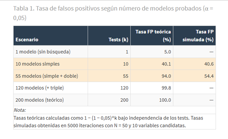 Con la corrección aplicada, las tasas de falsos positivos caen al 4,7% y 2,0% respectivamente, recuperando prácticamente la garantía nominal del 5%. El problema es que casi ningún investigador que practica specification search aplica esta corrección, entre otras razones porque hacerlo requeriría admitir cuántas especificaciones se probaron antes de encontrar «la buena».