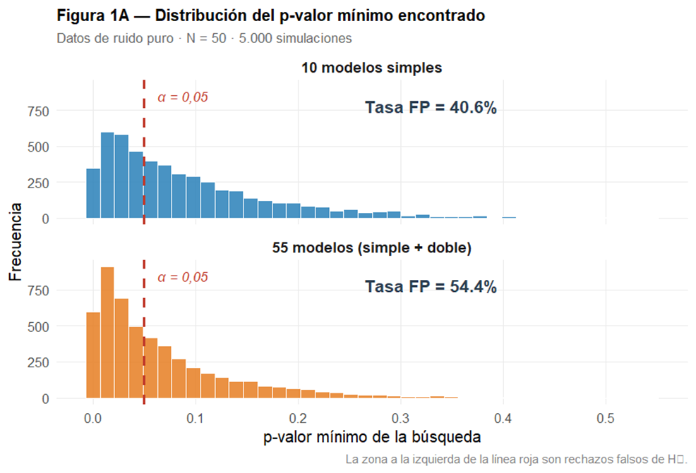 Nuestro experimento de laboratorio lo demuestra sin ambigüedad: con datos de puro ruido, la specification search produce «resultados significativos» en más del 40% de los casos con solo 10 modelos probados, y en más del 54% con 55 modelos. La «estrella» de «p < 0,05» que adorna tantos artículos académicos no es garantía de que algo real haya sido descubierto. A veces es solo el resumen de una tarde de pesca.