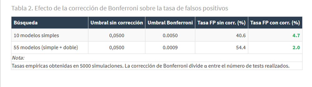 La corrección de Bonferroni divide el umbral α (significación estadística establecida) entre el número de tests realizados. Con 10 modelos el umbral pasa a 0,0050; con 55, a 0,0009. La Tabla 2 muestra el efecto dramático de esta corrección: