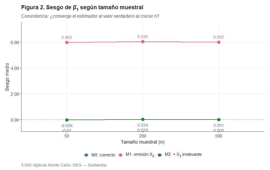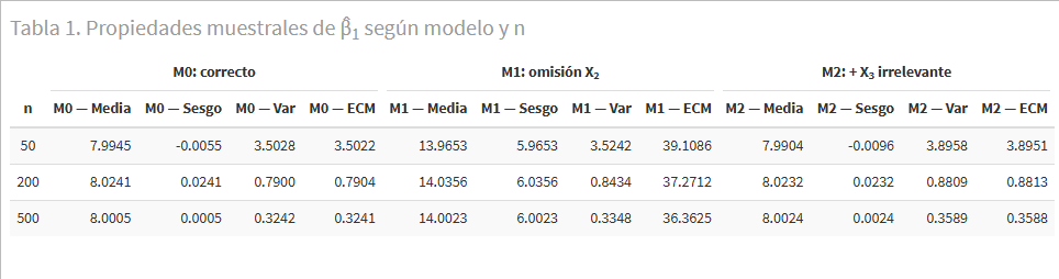 (*) Una nota sobre multicolinealidad. En M0, X₁ y X₂ presentan una correlación de ρ₁₂ = 0,60, lo que implica un VIF ≈ 1,56 para ambos regresores. Es una multicolinealidad débil, lejana de los umbrales habitualmente preocupantes (VIF > 5 ó > 10). No obstante, es precisamente esta correlación la que amplifica el sesgo de omisión en M1.