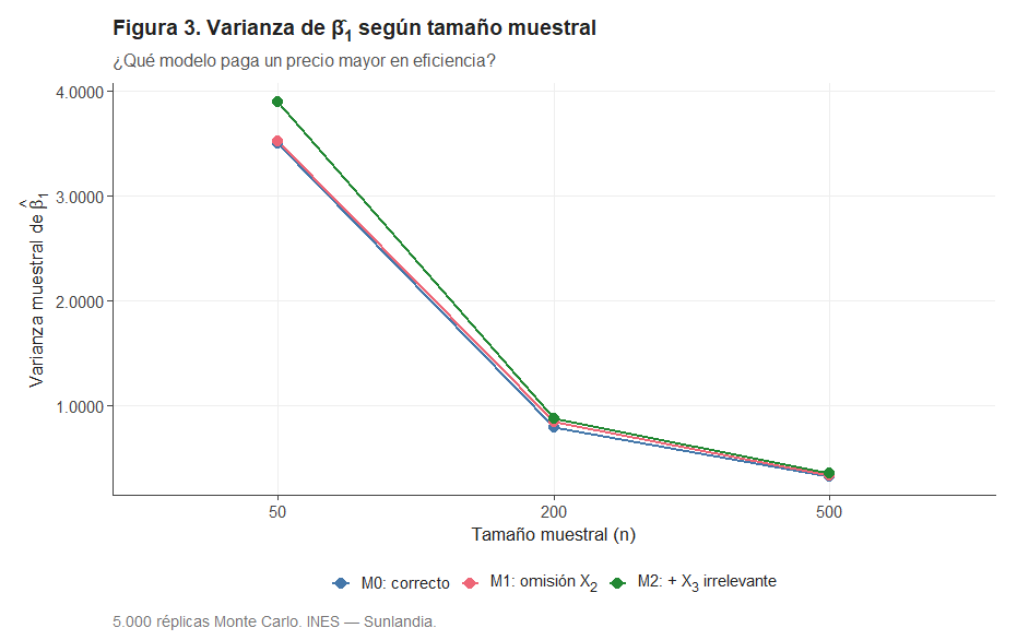 Los tres modelos convergen hacia cero al crecer n, pero el patrón relativo es revelador. M1 no es el más ineficiente en varianza: con un solo regresor, su estimador resulta algo menos variable que en los modelos con dos o tres regresores. Sin embargo, M1 tiene un sesgo contundente. El ECM (Varianza + Sesgo²) es la métrica que integra ambas dimensiones, y en esa métrica M1 pierde por goleada.