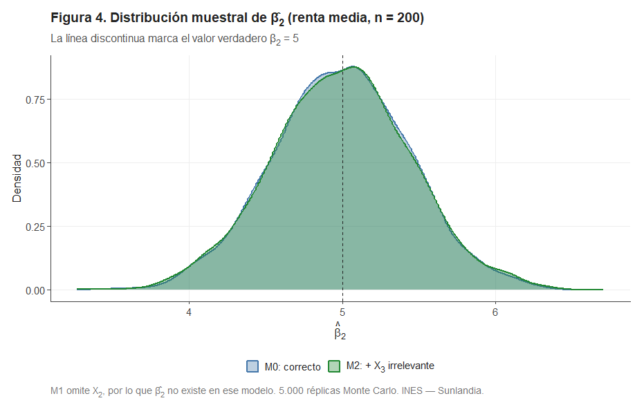 Incluir X₃ (irrelevante) no introduce ningún sesgo en La Figura 6 muestra la distribución de en M0 y M2 para n = 200.. Ambas distribuciones están centradas en el valor verdadero β₂ = 5 con dispersión prácticamente idéntica. M2 paga un peaje mínimo en eficiencia, pero no deteriora la estimación de los coeficientes relevantes. En M1, β₂ no existe: el efecto de la renta queda enterrado bajo el sol.