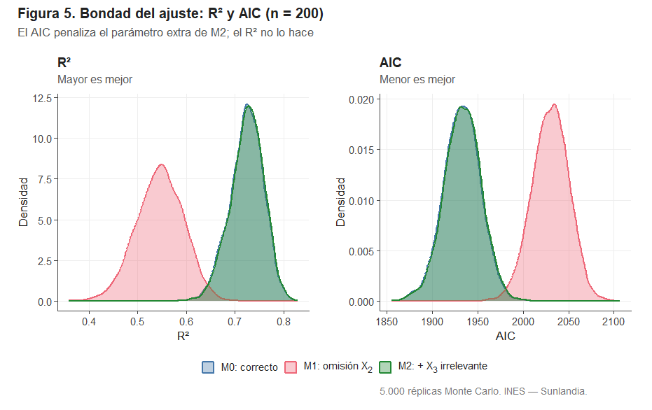 M1 muestra un R² sistemáticamente inferior (≈ 0,54 frente a ≈ 0,72 de M0): al omitir la renta pierde una parte sustancial del poder explicativo. M2 obtiene un R² prácticamente idéntico al de M0 —añadir una variable irrelevante nunca puede reducir el R², por construcción matemática—. El AIC, sin embargo, detecta el exceso de complejidad de M2 y le asigna un valor ligeramente peor que a M0. El AIC «sabe» que X₃ no añade información real; el R² no lo sabe.