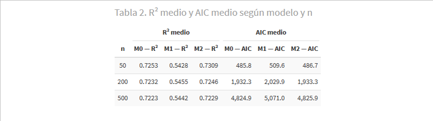La Figura 5 muestra la distribución del R² y del AIC (Criterio de Información de Akaike) para los tres modelos con n = 200. El R² mide la proporción de varianza explicada (mayor es mejor); el AIC penaliza la complejidad del modelo (menor es mejor).