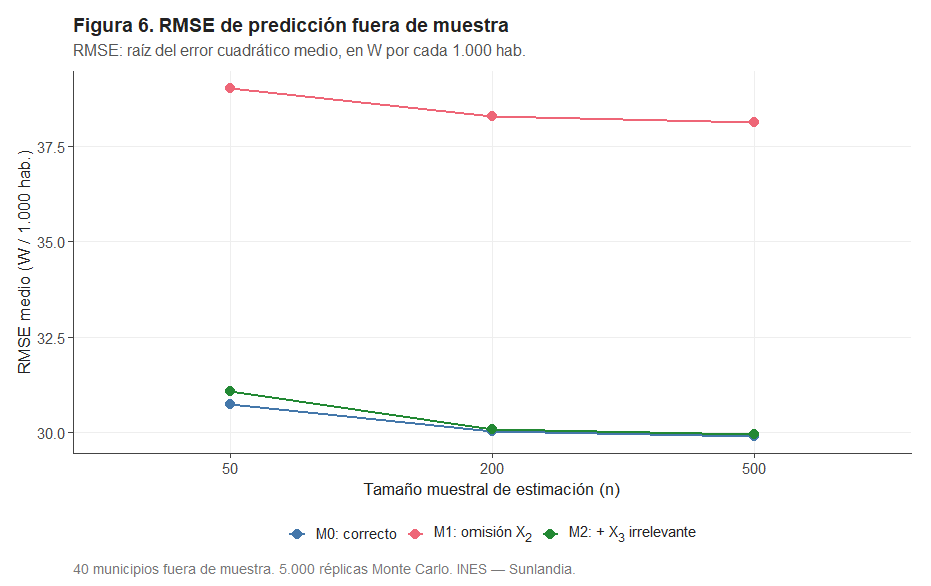 M1 produce errores de predicción de en torno a 38–39 W/1.000 hab., frente a los 30 W/1.000 hab. de M0: un 27% más. Y lo más llamativo: aumentar la muestra de 50 a 500 municipios apenas reduce el RMSE de M1. El sesgo no desaparece con más datos, y se paga directamente en la predicción. M2 es prácticamente indistinguible de M0 en términos predictivos.