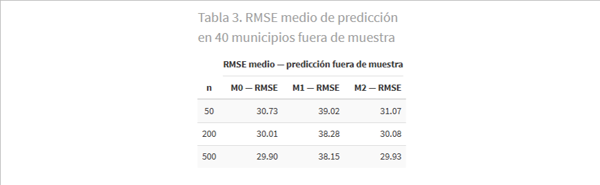 La prueba definitiva es la predicción sobre municipios no observados. En cada réplica se calculó el RMSE (Raíz del Error Cuadrático Medio, en W/1.000 hab.) sobre 40 municipios fuera de muestra.