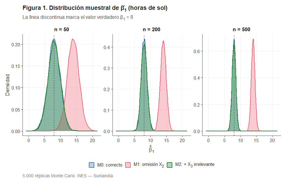 El resultado es inequívoco. M0 y M2 producen distribuciones perfectamente centradas en β₁ = 8: sus estimadores son insesgados. M1 desplaza toda la distribución hacia la derecha, acumulándose alrededor de 14. El estimador del efecto del sol sobreestima sistemáticamente en casi 6 unidades.