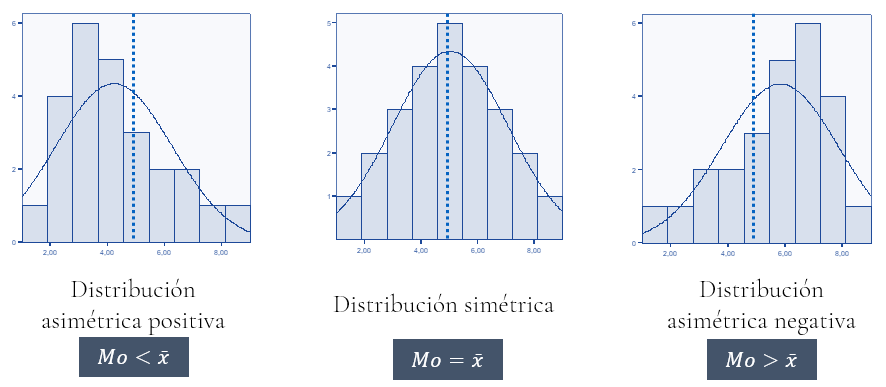 La asimetría —cuantificada habitualmente mediante el coeficiente g1 de Fisher— mide el grado en que la distribución se «ladea» respecto a su centro: una distribución simétrica tiene g1 = 0; si la cola derecha es más larga que la izquierda, g1 > 0 (asimetría positiva o hacia la derecha); si ocurre lo contrario, g1 < 0 (asimetría negativa o hacia la izquierda). La asimetría tiene implicaciones prácticas directas: en finanzas, una distribución de rendimientos con cola derecha larga puede ser deseable para el inversor; en gestión de riesgos, una cola izquierda larga indica mayor probabilidad de pérdidas extremas que lo que sugiere la desviación típica.