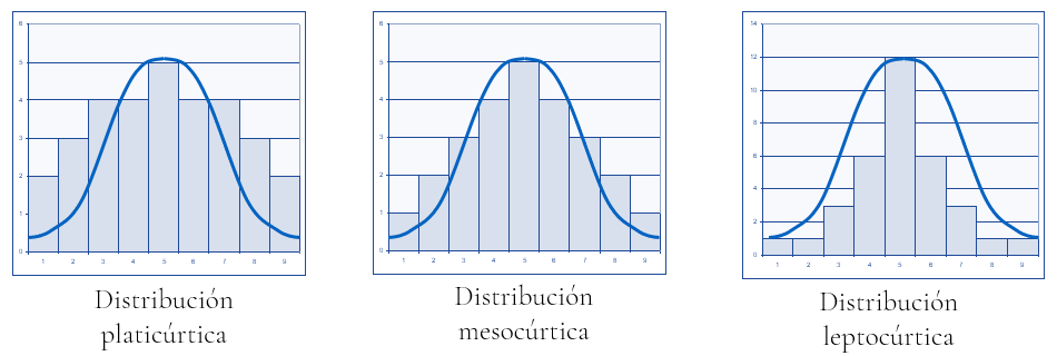 El apuntamiento —medido por el coeficiente g2 de Fisher, describe la «forma vertical» de la distribución: cuánta masa se concentra en el centro y cuánta en las colas, en comparación con la distribución normal. Una distribución platicúrtica (g2 < 0) es más achatada que la normal, con colas más ligeras y menos masa en el centro: los valores extremos son relativamente infrecuentes. Una distribución mesocúrtica (g2 ≈ 0) se comporta como la normal en lo que a apuntamiento se refiere. Una distribución leptocúrtica (g2 > 0) presenta un pico más pronunciado y colas más pesadas que la normal: los valores extremos son más frecuentes de lo esperado.