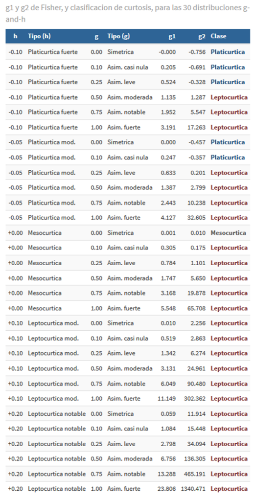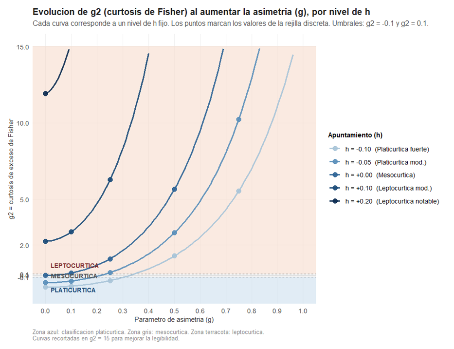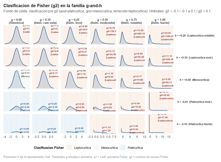 Las conclusiones son inmediatas. Para h = −0.10 y h = −0.05 —distribuciones platicúrticas reales—, Fisher cambia su clasificación a leptocúrtica con g = 0.50 y g = 0.25 respectivamente. Para h = 0.00 —distribución mesocúrtica real—, el cambio ocurre ya en g = 0.10. Las distribuciones con h positivo no cambian de clase —siempre son leptocúrticas para Fisher—, pero eso no las exime del problema: sus valores de g2 se inflan de forma tan pronunciada que cualquier comparación cuantitativa entre ellas queda distorsionada.