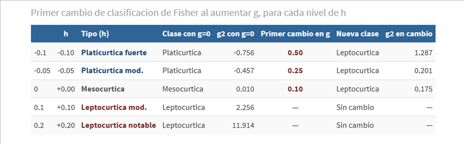• El umbral de cambio de clasificación llega antes de lo que uno espera. Para una distribución con h = −0.05 (ligeramente platicúrtica), el cambio de clasificación se produce en g = 0.25, un nivel de asimetría que en muchos contextos aplicados se consideraría «moderado» o incluso «leve».