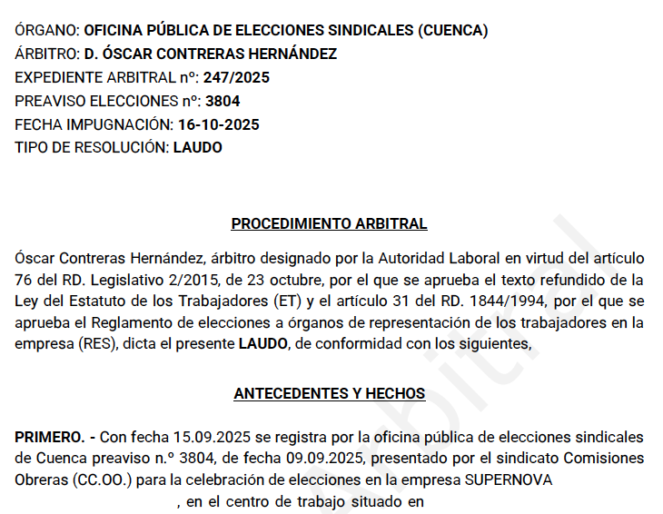 Laudo arbitral número 247/2025 emitido en Cuenca para dar respuesta a la impugnación de un procedimiento de elecciones sindicales en el que se plantea la nulidad por la no entrega del censo laboral por parte de la empresa.