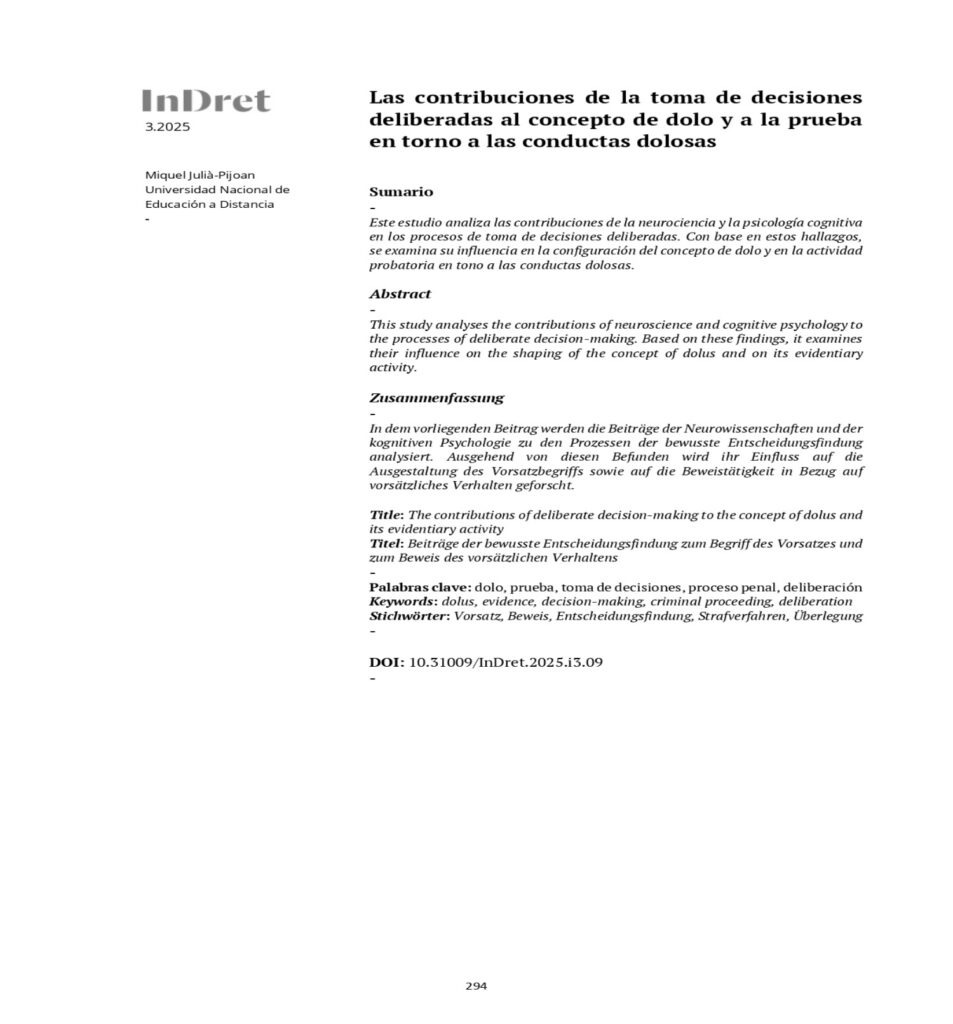 Título: Las contribuciones de la toma de decisiones deliberadas al concepto de dolo y a la prueba