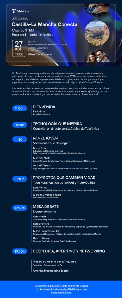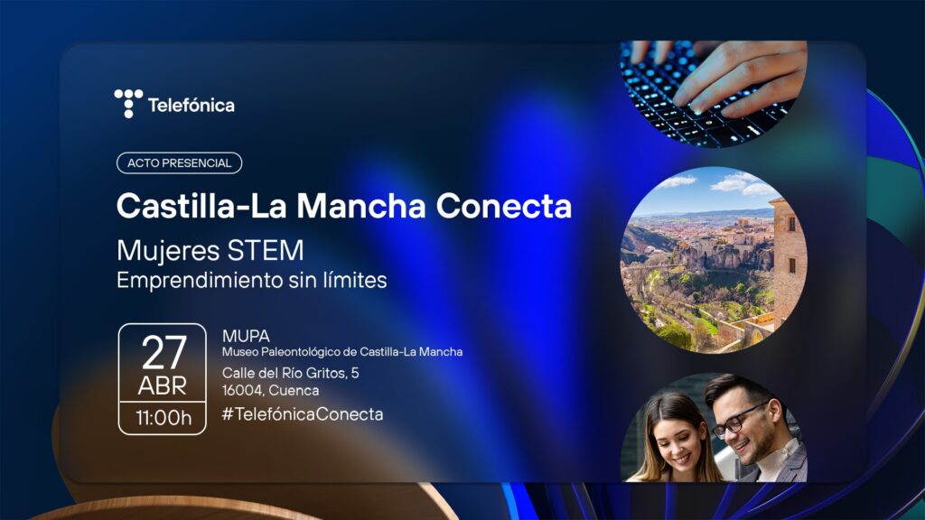 Telefónica, con el apoyo de nuestra Cátedra, celebra el día 27 de abril en Cuenca, una jornada denominada “Mujeres STEM: emprendimiento sin límites” como una oportunidad para visibilizar el papel esencial de las mujeres en la ciencia y la tecnología, así como para inspirar a las jóvenes que darán forma al mundo digital del mañana en Cuenca y en Castilla – La Mancha.