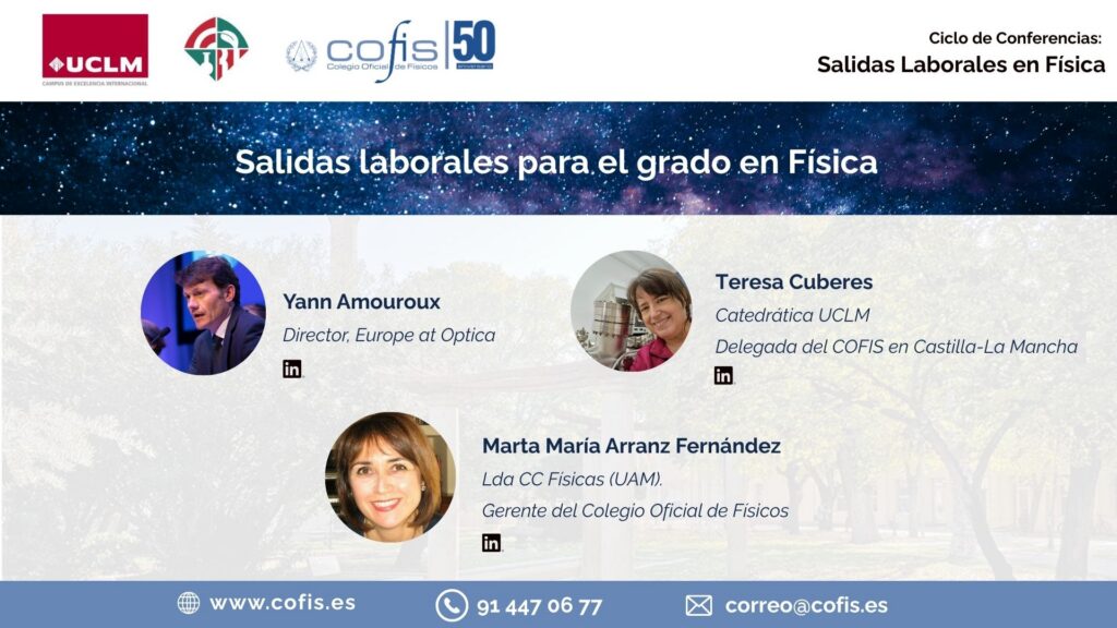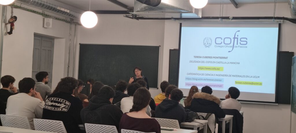 El pasado viernes 6 de febrero, Marta Arranz (Gerente del COFIS) y Teresa Cuberes (Delegada del COFIS en Castilla-La Mancha) participaron en la Jornada sobre Orientación Profesional y Empleabilidad organizada por la Facultad de Ciencias Ambientales y Bioquímica de la UCLM. En la presentación de Marta Arranz, se ilustró la diversidad de salidas profesionales de la Física, enfatizándose la importancia de la formación continua, y el papel del Colegio como estructura de apoyo y orientación. En el acto se discutieron las preguntas planteadas por los alumnos asistentes (en su mayoría de 3º curso de la titulación de Físicas, de la primera promoción que se imparte en la UCLM) y se sortearon 3 pre-colegiaciones. La jornada concluyó con un intercambio enriquecedor de ideas y experiencias, que permitió estrechar la relación entre el Colegio y el alumnado, reforzando el compromiso de mantener un contacto continuo en el futuro. Desde el COFIS se seguirá apostando por este tipo de iniciativas, orientadas a acompañar a los futuros profesionales desde su etapa formativa, aportándoles información, apoyo y herramientas que contribuyan a su desarrollo académico y laboral.